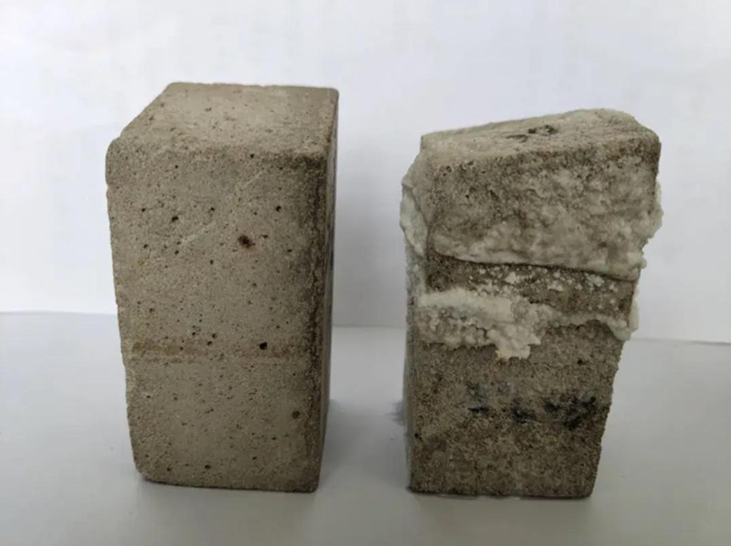 硅烷处理块(左)与空白块(右)长期冻融对比