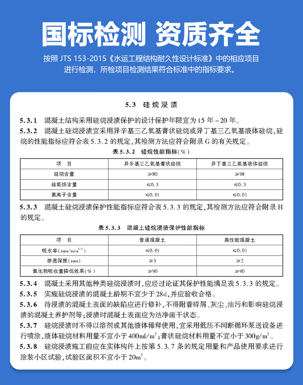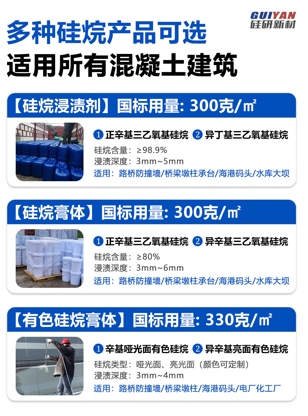 本产品为辛基三乙氧基硅烷膏体和水性聚合物有机硅防腐涂料双组份,它能渗入混凝土内部3mm以上,在内部发生化学反应,形成深度达3mm以上的防水保护层,又使外部形成厚度约200um的防腐漆膜,从外部和内部阻止了水分和有害物质的侵入。