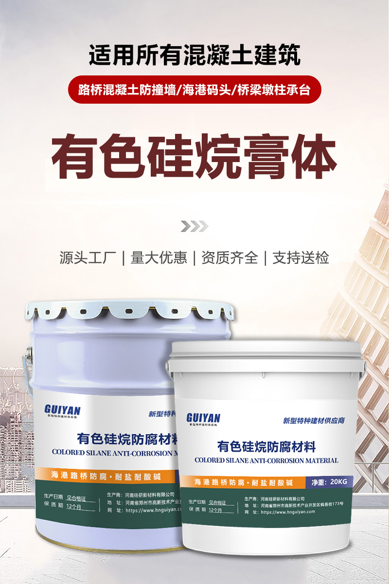 有色硅烷膏体可按要求进行调色,哑光面一般常用颜色有[浅灰色、中灰色、深灰色]三种。常用于混凝土的防水防腐和色差修补,兼具混凝土防腐和混凝土美化两大功能。